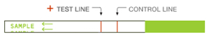 下圖為T.cruzi陽性的結果示意圖。檢測條顯示紅色或是淡粉色的時候代表是T.cruzi 抗体陽性。檢測條沒有顯示顔色則是代表陰性。若對照條沒有呈現顔色則代表實驗本身有問題需要重新調整再來一次。